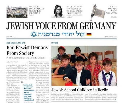 The Jewish Voice logo features its name in English and Hebrew, with a small German flag on one side and a Star of David on the other.