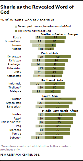 According to the survey findings, most Muslims believe sharia is the revealed word of God rather than a body of law developed by men based on the word of God: