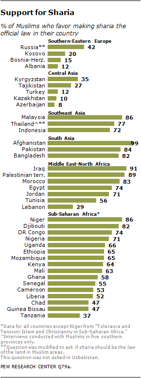 Overwhelming percentages of Muslims in many countries want Islamic law (sharia) to be the official law of the land, according to a worldwide survey by the Pew Research Center. But many supporters of sharia say it should apply only to their country’s Muslim population. (Emphasis mine)