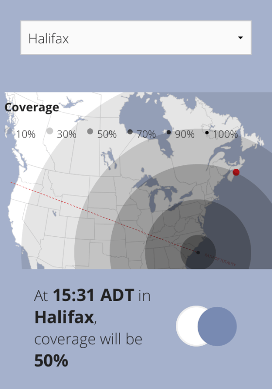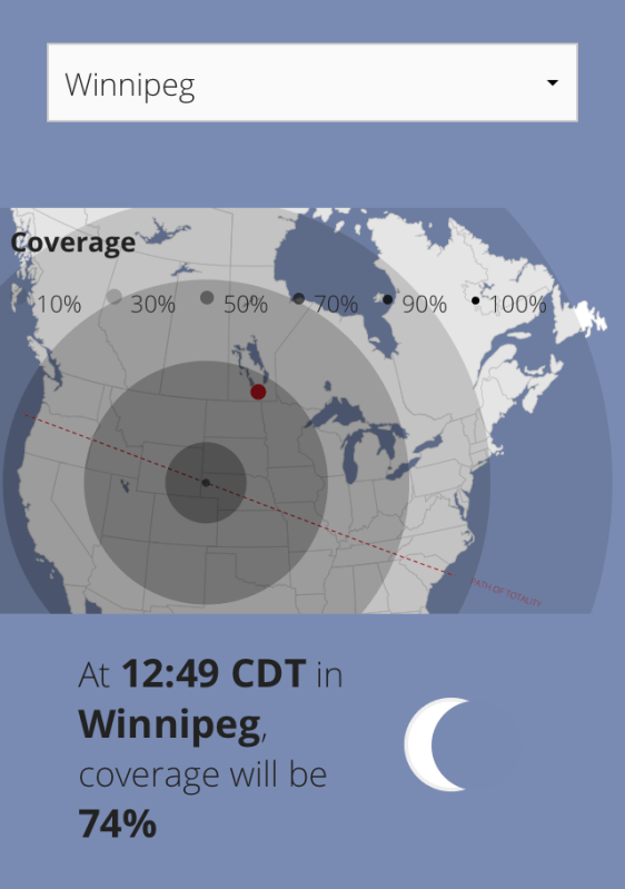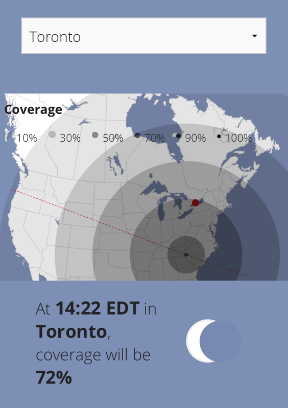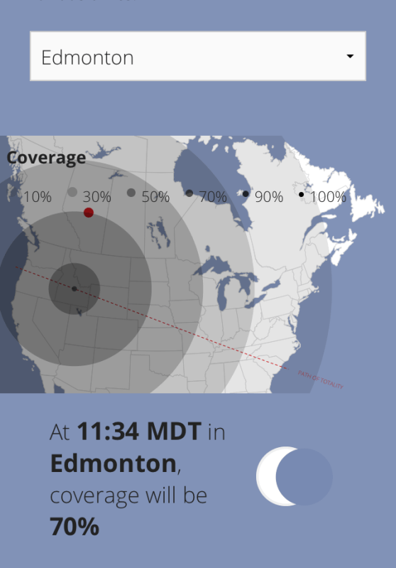 The celestial event got its name because totality (complete coverage of the sun by the moon) will occur across a swath of the U.S. stretching from Oregon to South Carolina. However, it will also be seen in almost every major city in Canada – in the West, at least 70-90% of it, and as you go further East, that will unfortunately drop. Every major city in Canada will have at least 50% partial eclipse, with the possible exception of St. John’s, Newfoundland and the Territories at around 26%. Victoria has the honor of being the first in Canada to see it, and the city that will have the most totality in the nation – at 90%. I’m excited that my home city of Vancouver will be at 86%, if they don’t spread chem trails across our sky first haha.