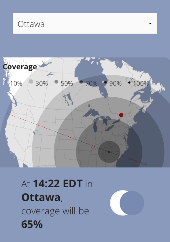 Subscribe to our YouTube channel to be advised later Saturday night when we release a video on the eclipse, that will show a very short clip with the total trajectory for every major city in Canada, in order starting from West to East. Stay tuned to our channel (Saturday evening)! I will also highlight them all here, with the MAXIMUM coverage showing only – you could be treated however to a partial eclipse that is equally cool up to the point of maximum totality – the eclipse could last up to 1.5 hours from start to finish in some cities. Again, if you visit our YouTube channel later Saturday evening, you can see when the eclipse will start, it’s maximum coverage and when it will end, for every major city in Canada (Montreal and Quebec City are together for some reason).