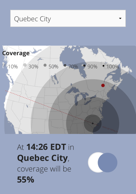 Remember that when the eclipse starts, it’ll barely be noticeable. Eventually, however, it’ll look like someone’s taken a bite out of the sun and increase from there. Our YouTube channel shows a little diagram for each city, showing what it will look like in your city.
