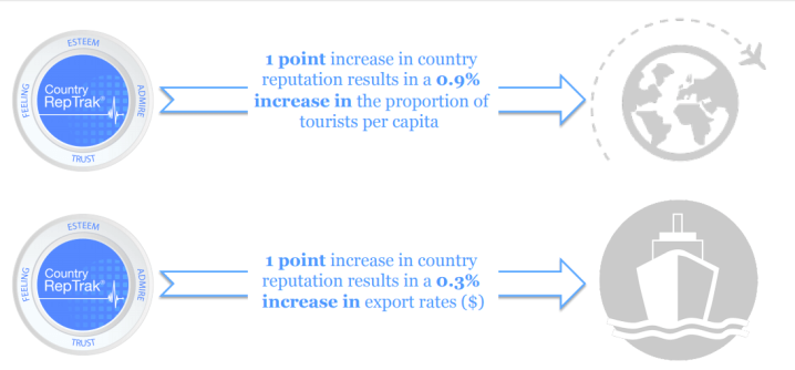 Our ranking score in 2018 was 79.2. It was 82.8 in 2017. Why does this drop matter? In 2017, when we were named #1, Lonely Planet’s website named us the best place in the world to visit that year. That’s an actual tourism boost, with all the dollars related to it, just for ranking higher in this annual survey. In fact, the Reputation Institute did an analysis of 72 of the top 100 countries in the rankings over the course of a year, and determined that the following on average was true: