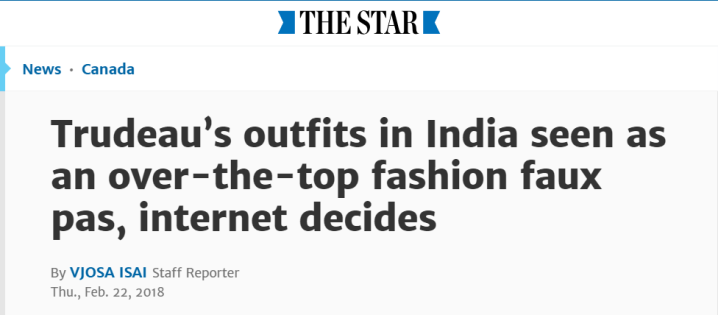 Look no further than the “costumes” (according to locals) worn by our idiot Prime Minister, Justa TrueDope, along with Mr. Dress-up’s entire family, when travelling to India earlier this year, as the Toronto Star headline screamed: